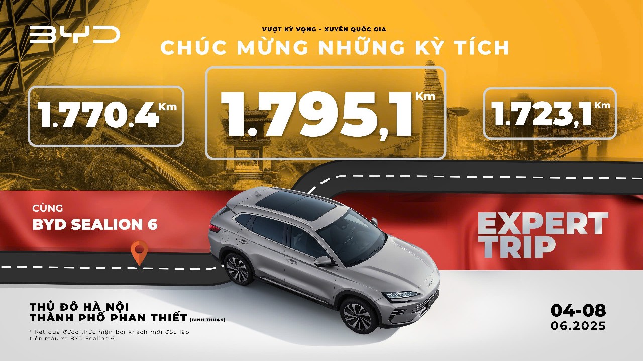 BYD Sealion 6 mới đây hoàn thành quãng đường từ Hà Nội tới Phan Thiết trong một chương trình dành riêng cho các tay lái là những khách mời nhiều kinh nghiệm trong giới truyền thông về ôtô tại Việt Nam. Theo đó, chiếc xe chạy được xa nhất ghi nhận kết quả 1.795,1 km, được đo bằng cách chạy cho tới khi xe cạn pin và xăng, không thể tiếp tục di chuyển. Sealion 6 có bình xăng dung tích 60 lít.